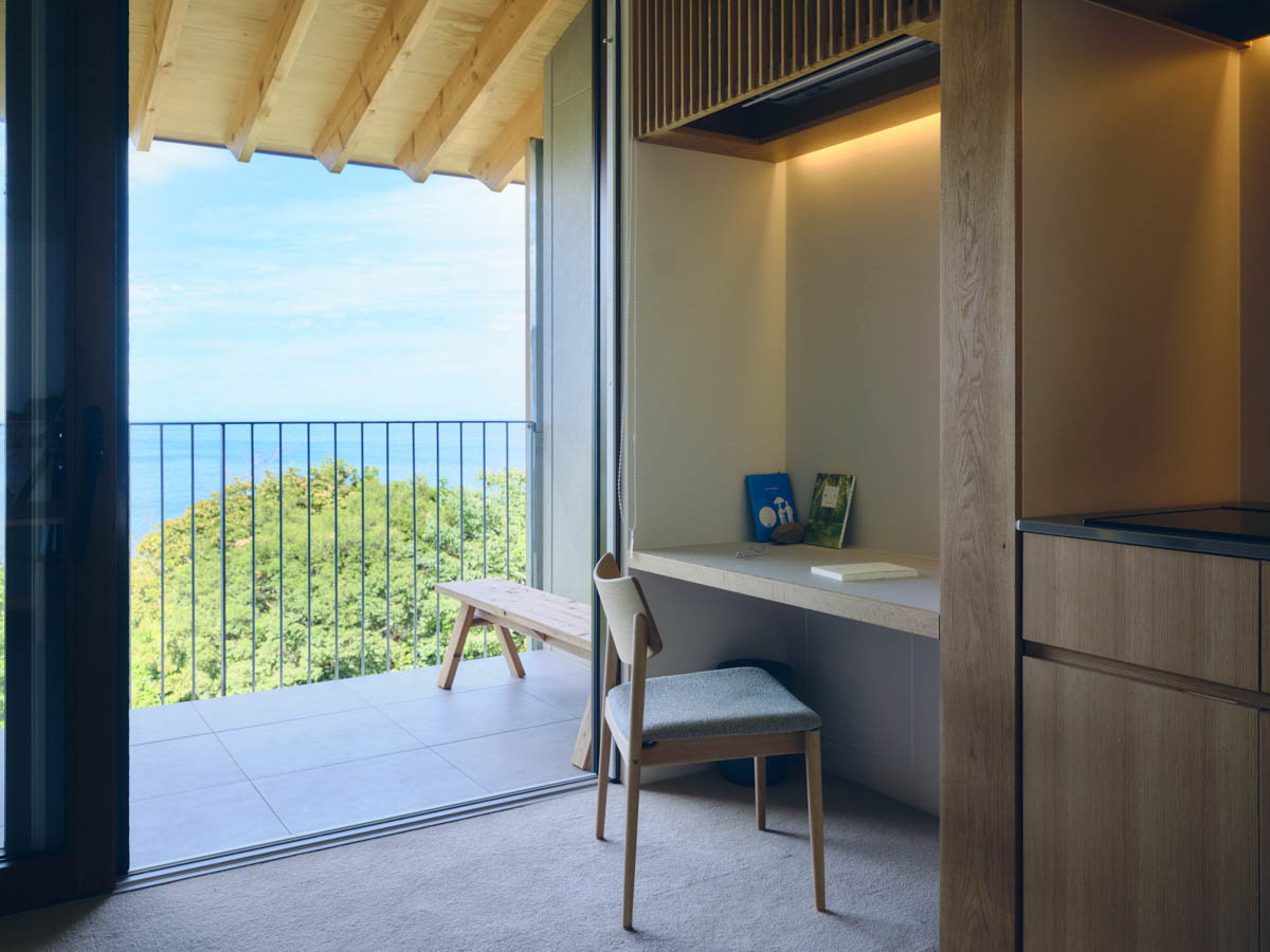 古賀:自然を思う存分楽しめることを意識し、すべての拠点で窓を大きく取り、場所や季節によって違う景色を楽しめるようにしています。またリビングとバルコニーを一体にしたり、外にお風呂を設けたりと、“自然の中に一歩出たくなる動線” も意識しているポイントです。人が触れる箇所は基本的に天然素材を使い、木や石が持つぬくもりや心地よさを感じてもらいたいと思っています。