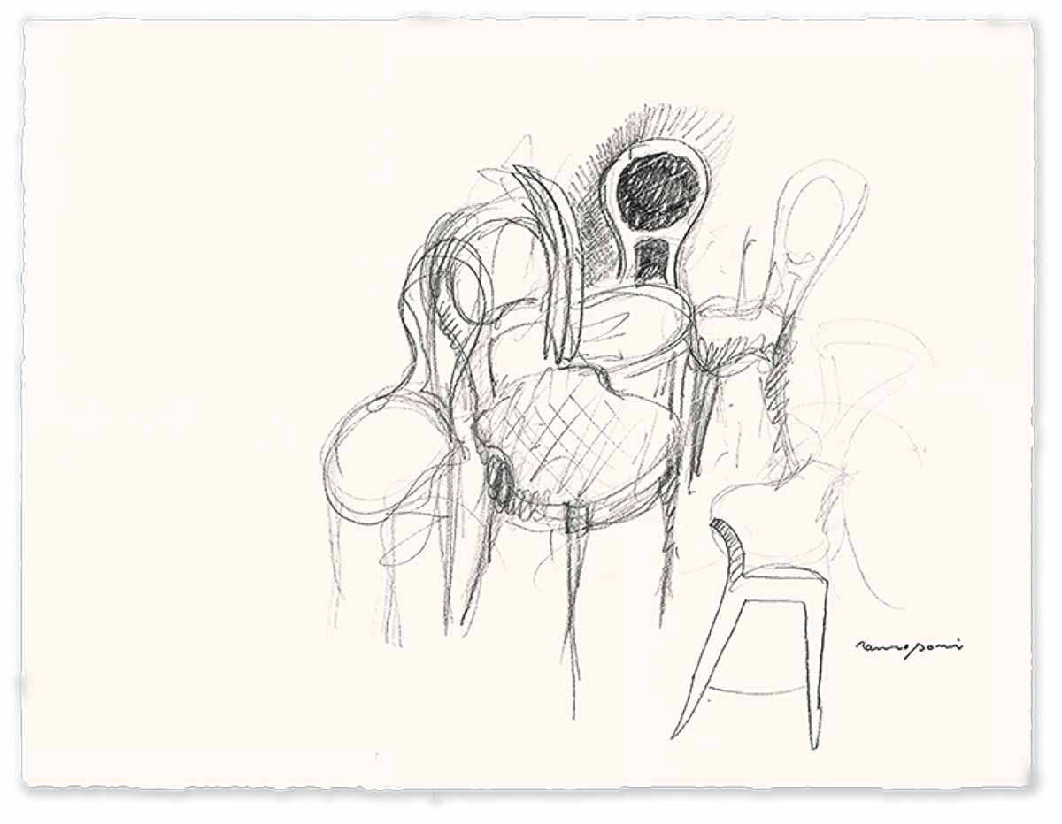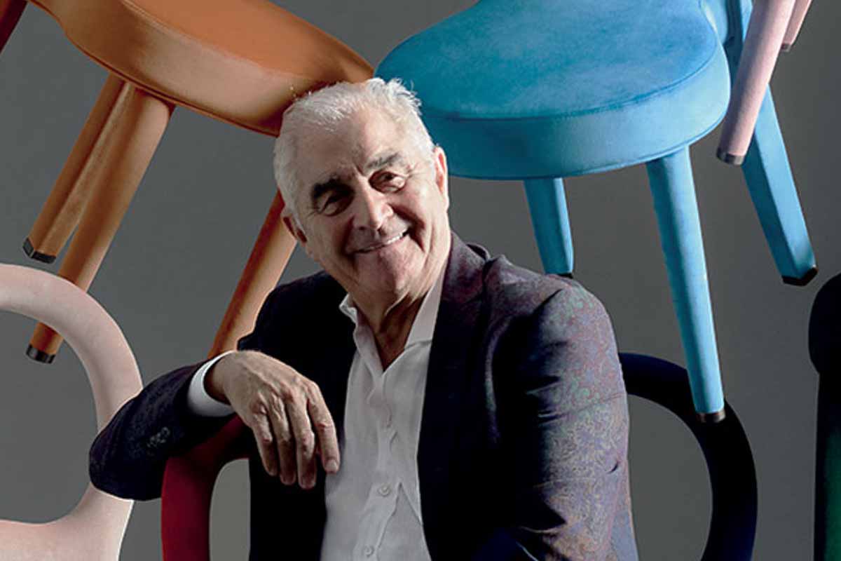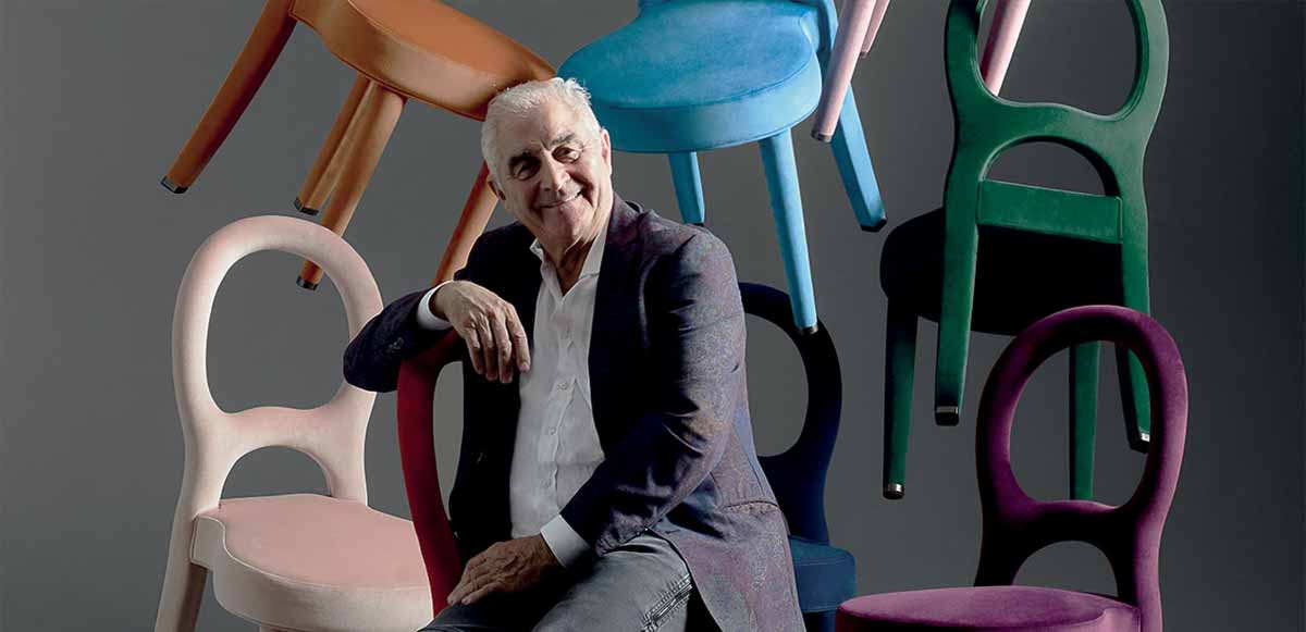 ロメオ・ソッツィ氏。自身が1999年にデザインした「Bilou Bilou(ビル・ビル)」チェアに囲まれて。
