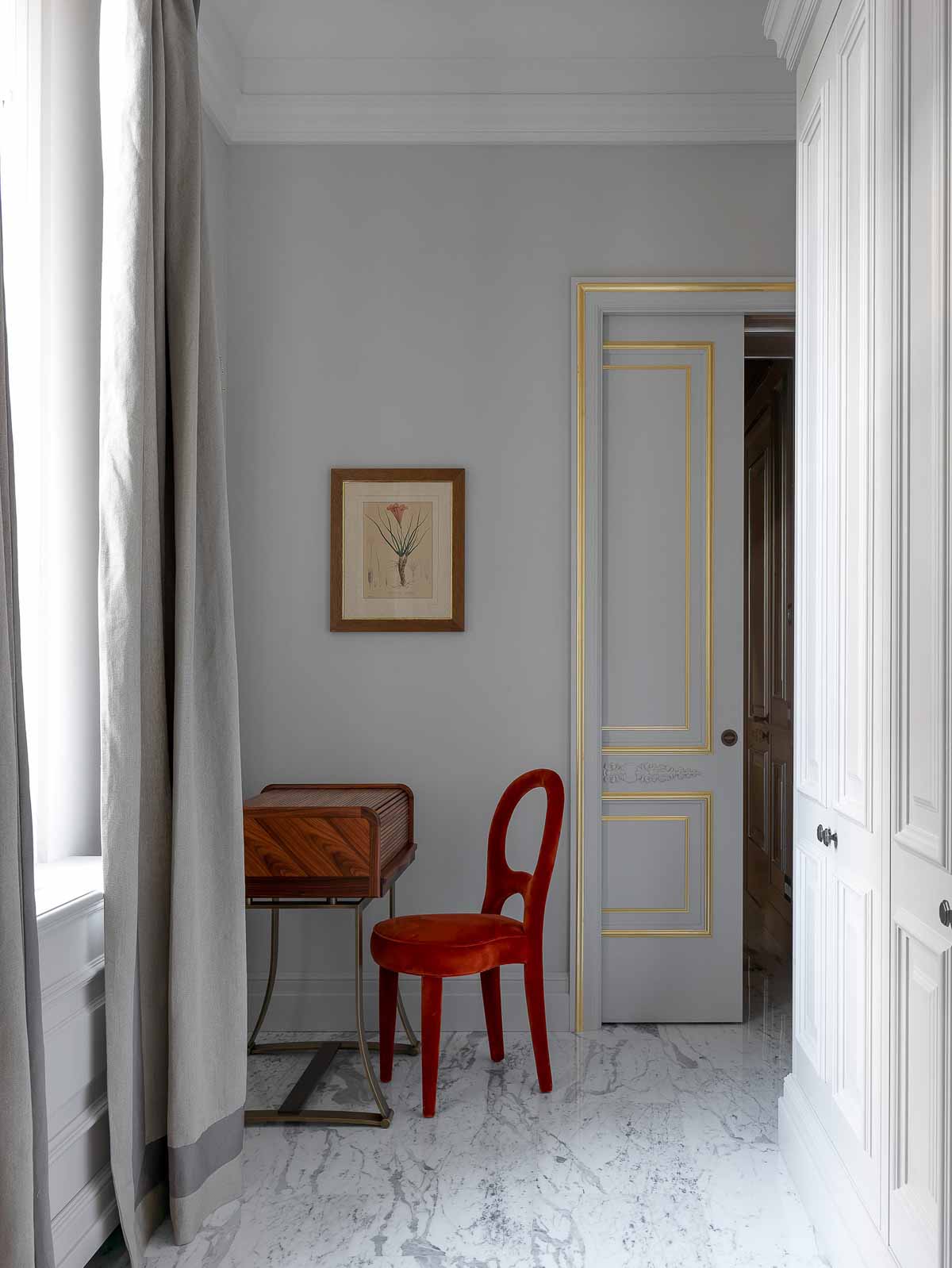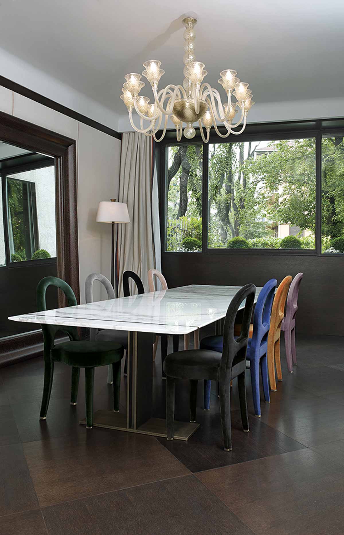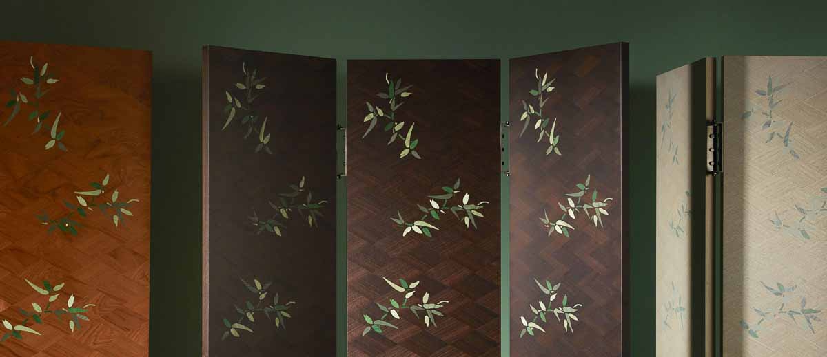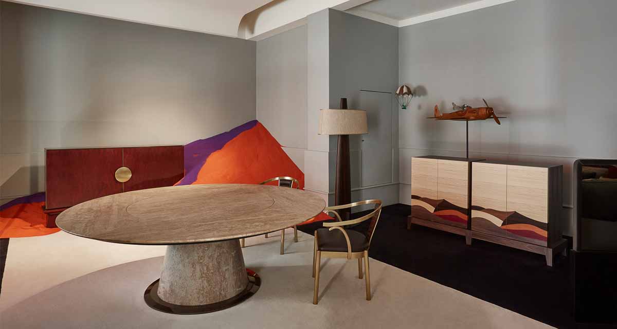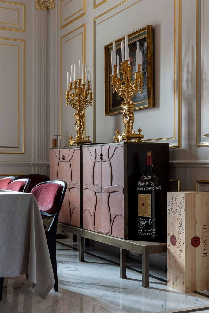 ロメオ:世界各地から選りすぐった木材。シルクやリネン、カシミアに、ブロンズやシルバーなどの金属を織り込んだマテリアル。ムラーノガラスや大理石、雪花石膏。そうした高級素材同士を組み合わせて、精緻なディテールへと造形していく。その贅沢な美しさは、見る人の心をとらえて離しません。