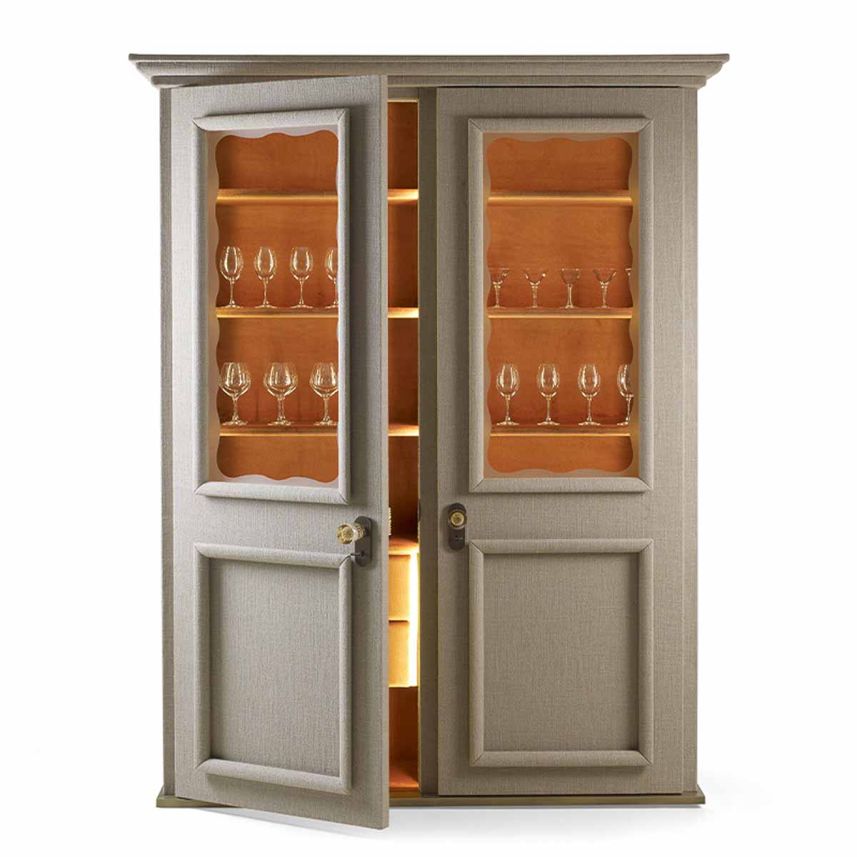 ロメオ:もう一つの代表作は「George(ジョージ)」キャビネットです。堂々とした存在感、張り地の豊かな表情、ムラーノガラスのノブ、レザー張りの引き出し、そして特徴的なヒノキの香りによって、その魅力が放たれます。