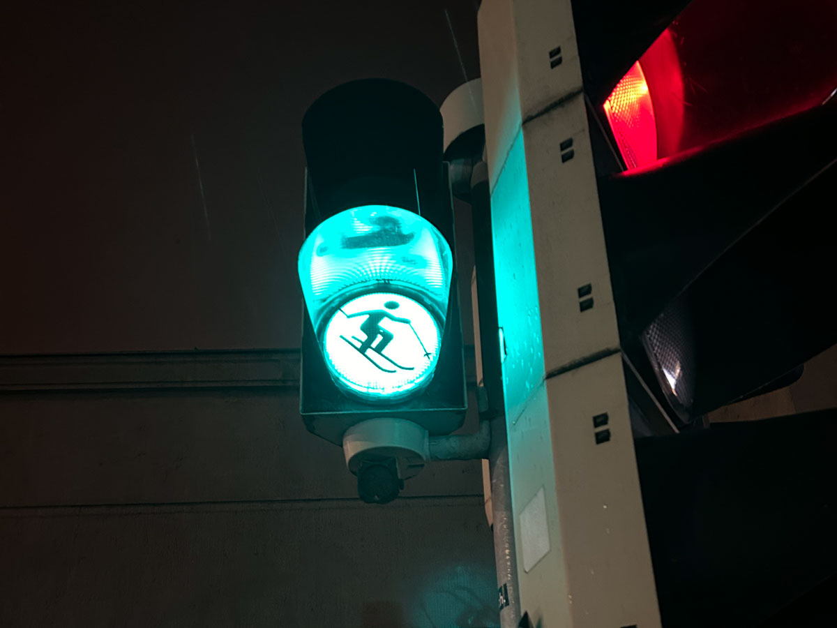 (下)信号機にもスキーのサインが。生活の中にスキーが息づいている。