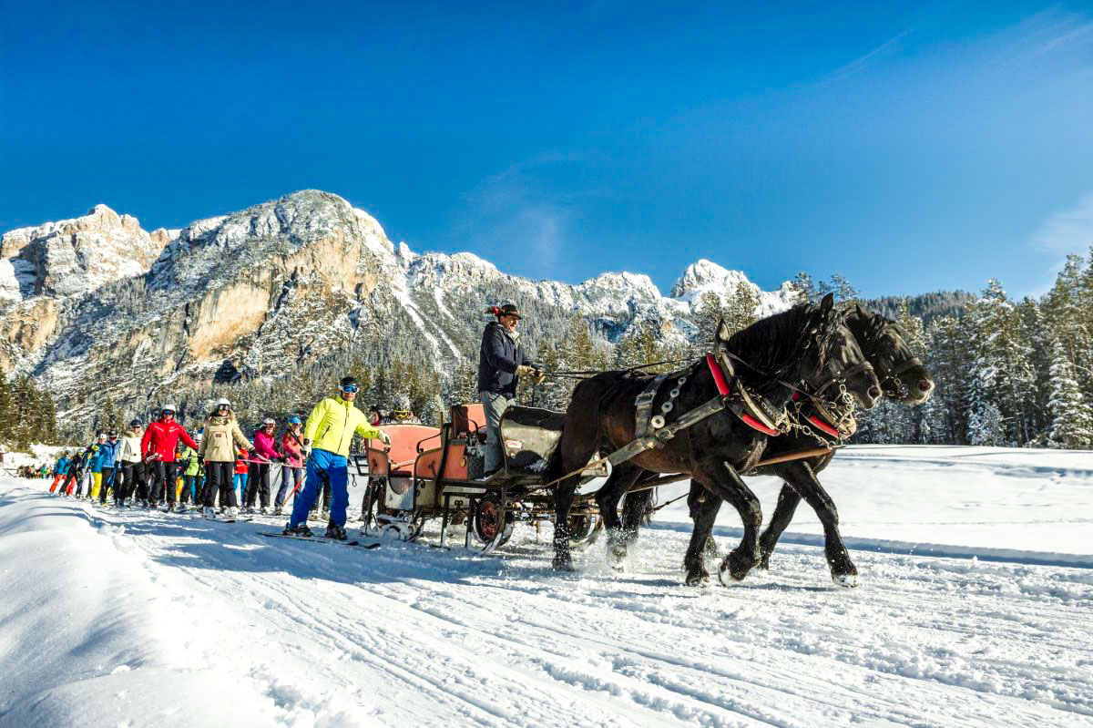 (下)馬がスキーヤーを引く光景。リフト間の移動にもエンターテインメント性が光る。