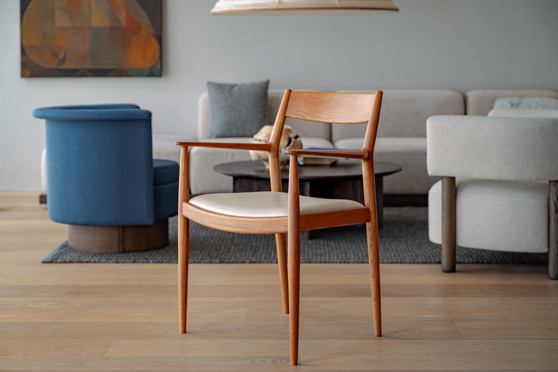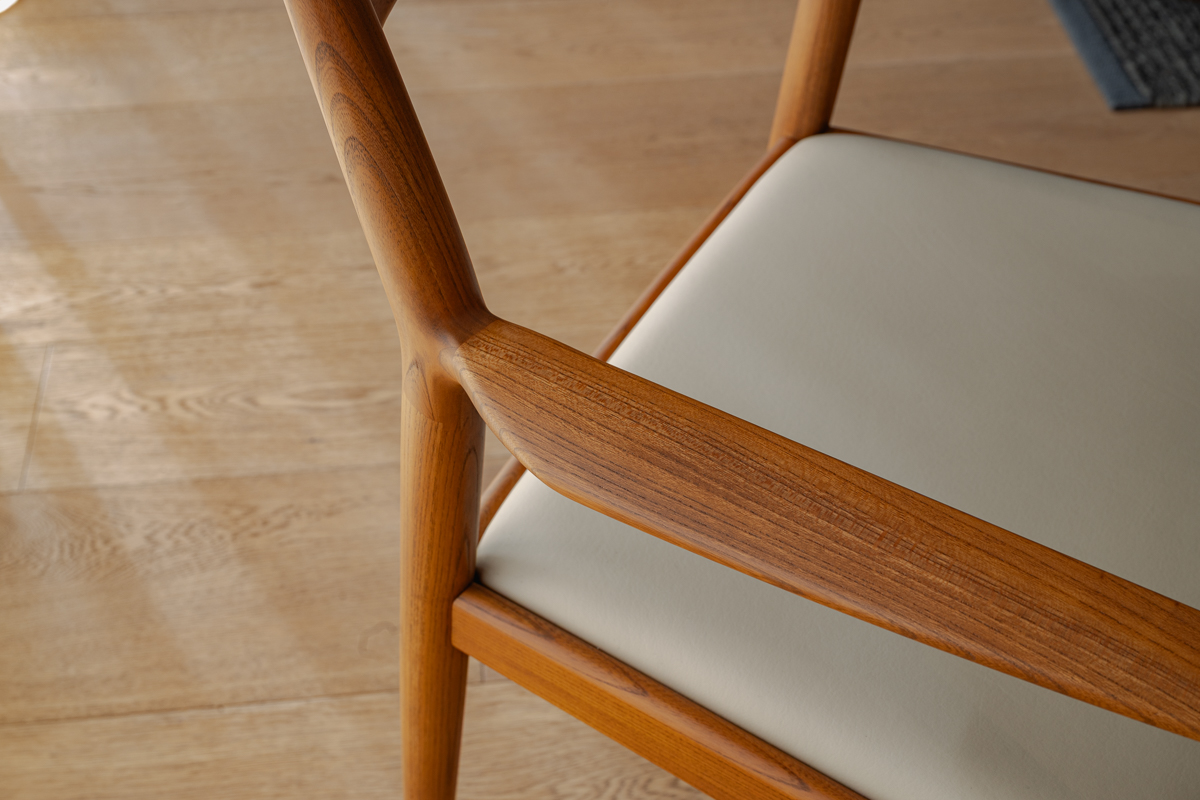 山室:北欧的なデザインの要素もありながら、接合部の木目の美しさは木にこだわるカリモク家具ならではのもの。一見、細く華奢な印象を受けますが、座ってみるととても安定感のある作りになっています。