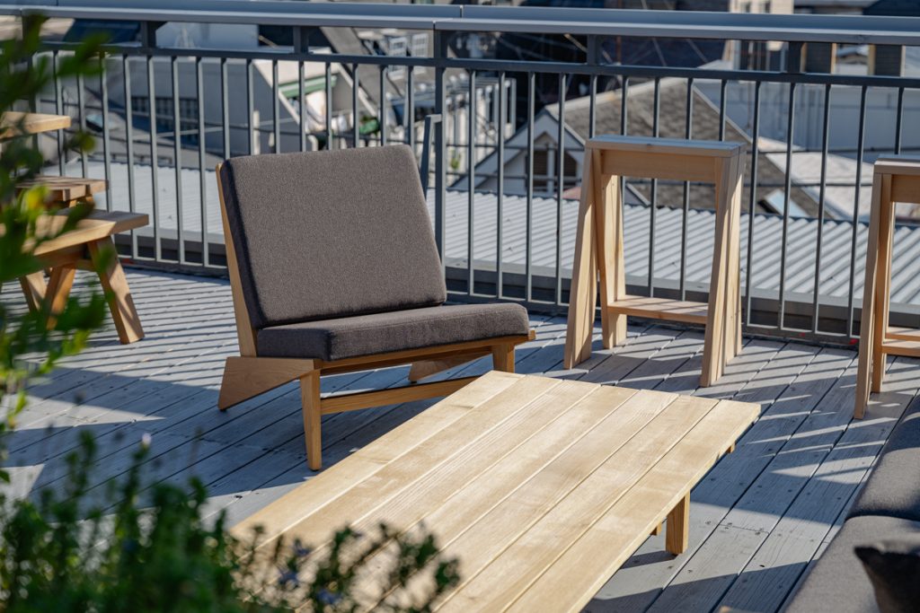金子:家具フロアについては、2階は「Karimoku Case」を中心にレイアウトし、3階は「Karimoku New Standard」・「MAS(マス)」の2ブランドを展示しています。屋上にも家具を配置していますが、ここはホッと一息つける場所でありながら、展示とプロダクトテストなども兼ねた実験的なスペース。まだ展開していない屋外家具の製品化を目指し、雨風にさらされる環境下で耐久性をチェックする場としても活用しています。
